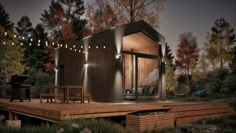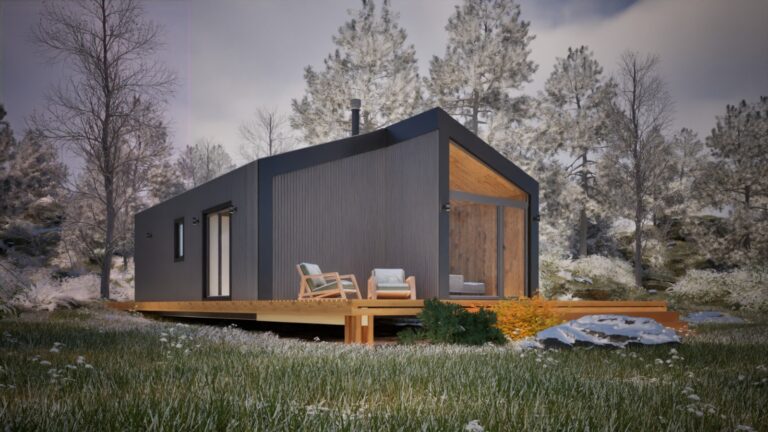 Revestimientos exteriores de chapa cincalum, chapa prepintada negra o madera de pino. Interior con placas de fenólico o machimbre de pino. Ducha revestida en porcelanato y pisos flotantes de PVC SPC click de alto tránsito.